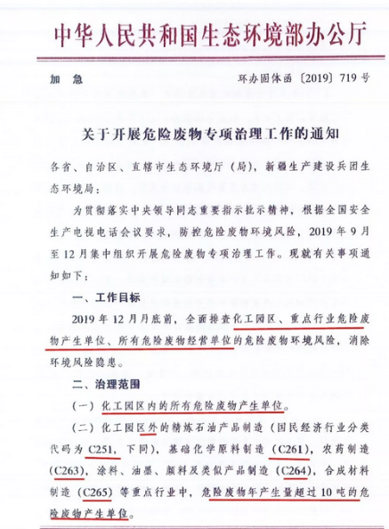 日前生態(tài)環(huán)境部印發(fā)加急文件《關(guān)于開展危險(xiǎn)廢物專項(xiàng)治理工作的通知》。 《通知》要求今年年底前,在全國(guó)范圍內(nèi)排查化工園區(qū)、重點(diǎn)行業(yè)危險(xiǎn)廢物產(chǎn)生單位、所有危險(xiǎn)廢物經(jīng)營(yíng)單位的危險(xiǎn)廢物環(huán)境風(fēng)險(xiǎn),消除環(huán)境風(fēng)險(xiǎn)隱患。[ 查看更多 ]